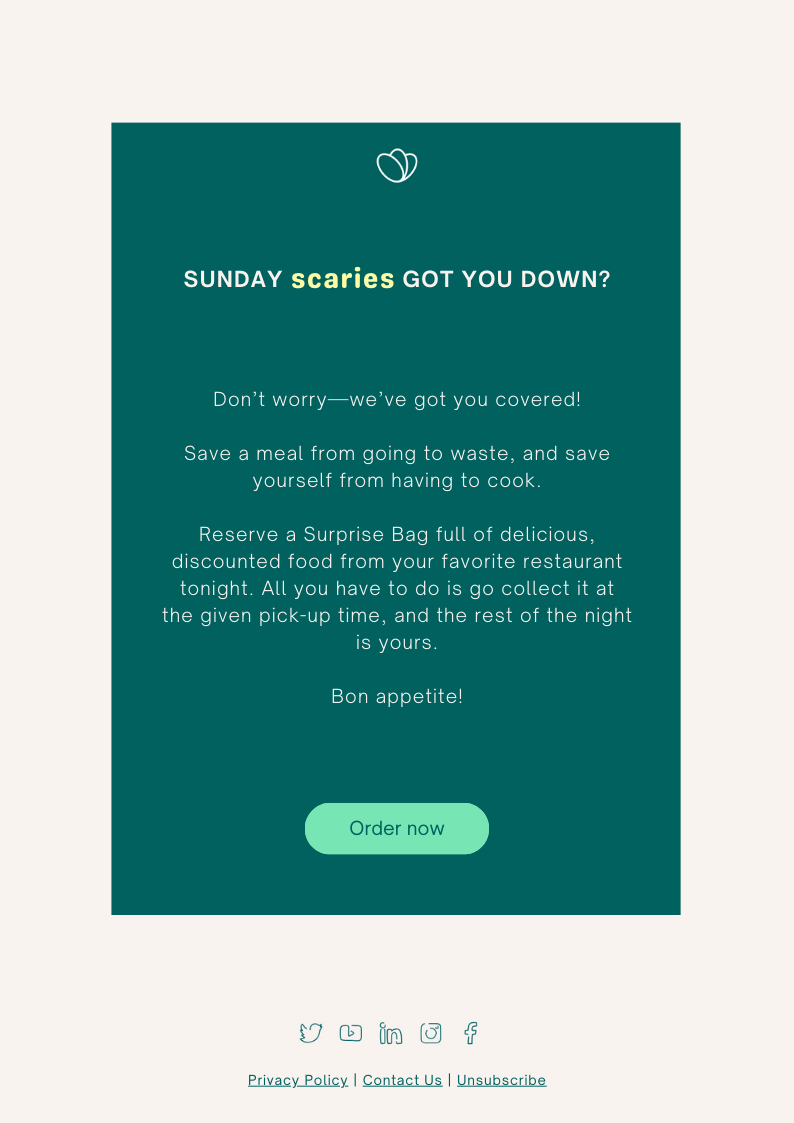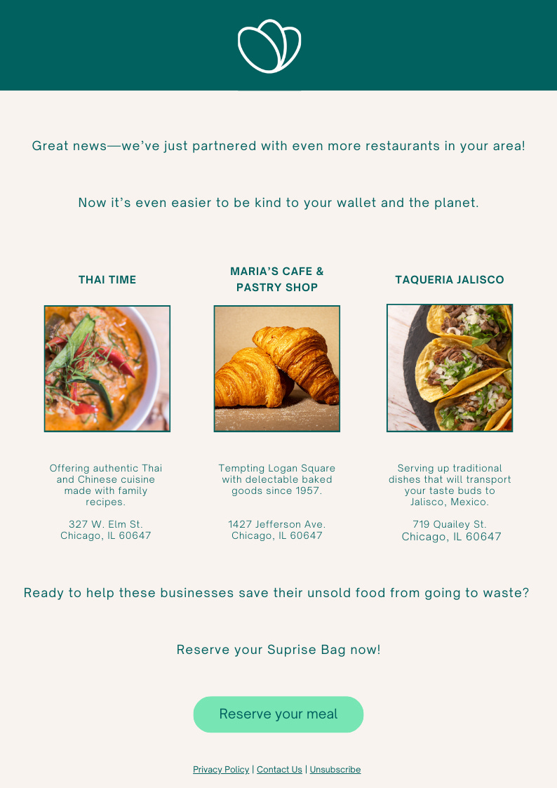 Reserve a Surprise Bag full of delicious, discounted food from your favorite restaurant tonight. All you have to do is go collect it at the given pick-up time, and the rest of the night is yours.